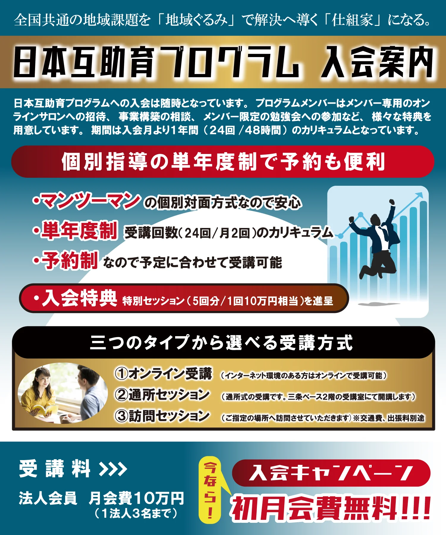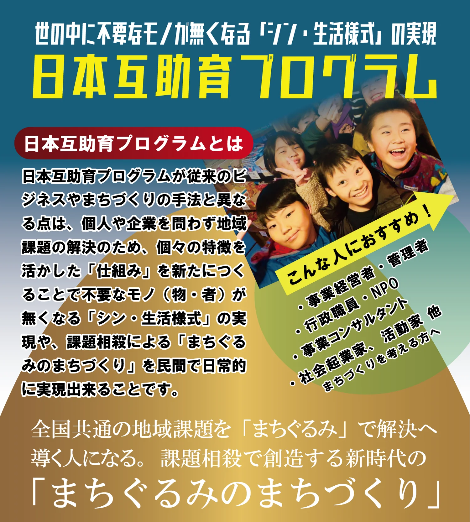 日本互助育プログラムは、従来のビジネス構築のための手法と異なり、自分自身に内在するマインドの起こし方、社会視点、イメージの具象化に至るまでの仕組みを理解し、自分自身のチカラで不可能を可能にしてゆく能力を身に着けるための様々なカリキュラムが用意されています。「学ぶ」・「行動」・「実現」を三位一体にした内容になっています。