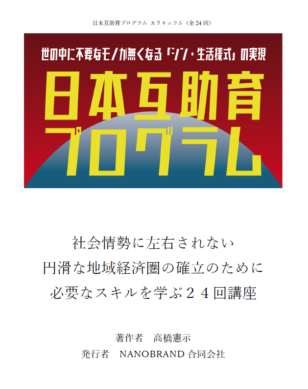 互助育(ごじょいく)とは、仕組家 高橋憲示が提唱する「互いに助け合いながら育ち合う」ことを理念とした社会起業家育成の考え方であり、グローバリストに左右されない地域課題の解決と持続可能な社会の実現を目指す日本思想「和」を現代に実装するための教育法です。NANOBRANDの「日本互助育プログラム」は「学び」「行動」「実現」の3つの要素、24項目のカリキュラムで現代社会の革新に必要不可欠な構成となっています。